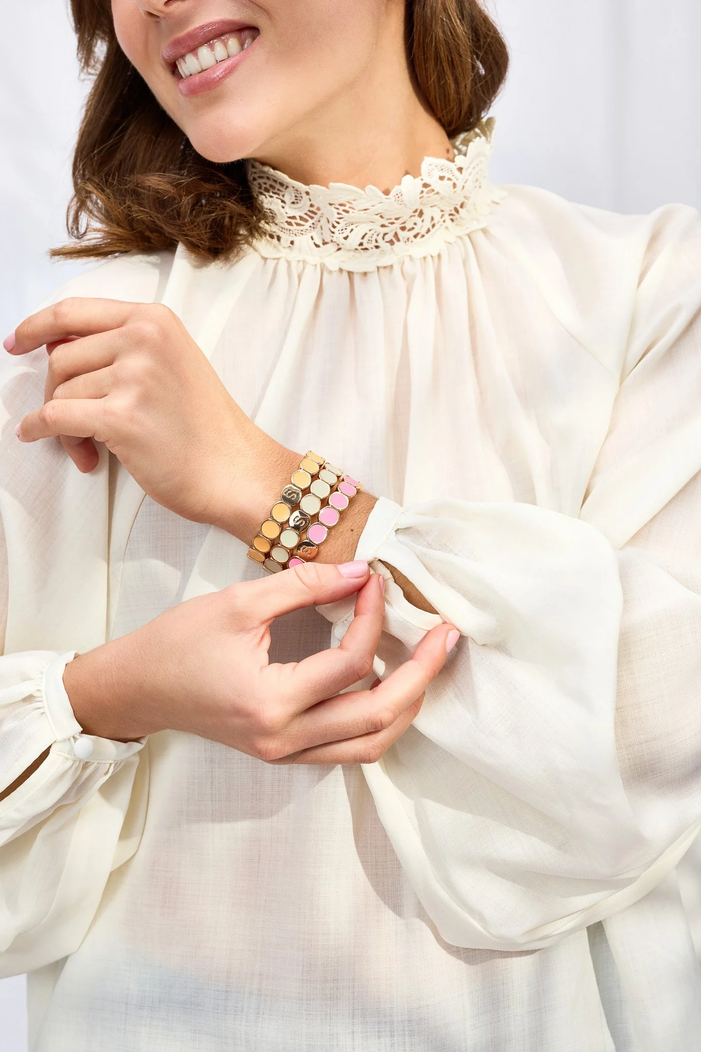 Bracelets accumulés, colliers délicats, bagues lumineuses : chaque pièce joue avec les couleurs, comme une palette émotionnelle à porter sur la peau.